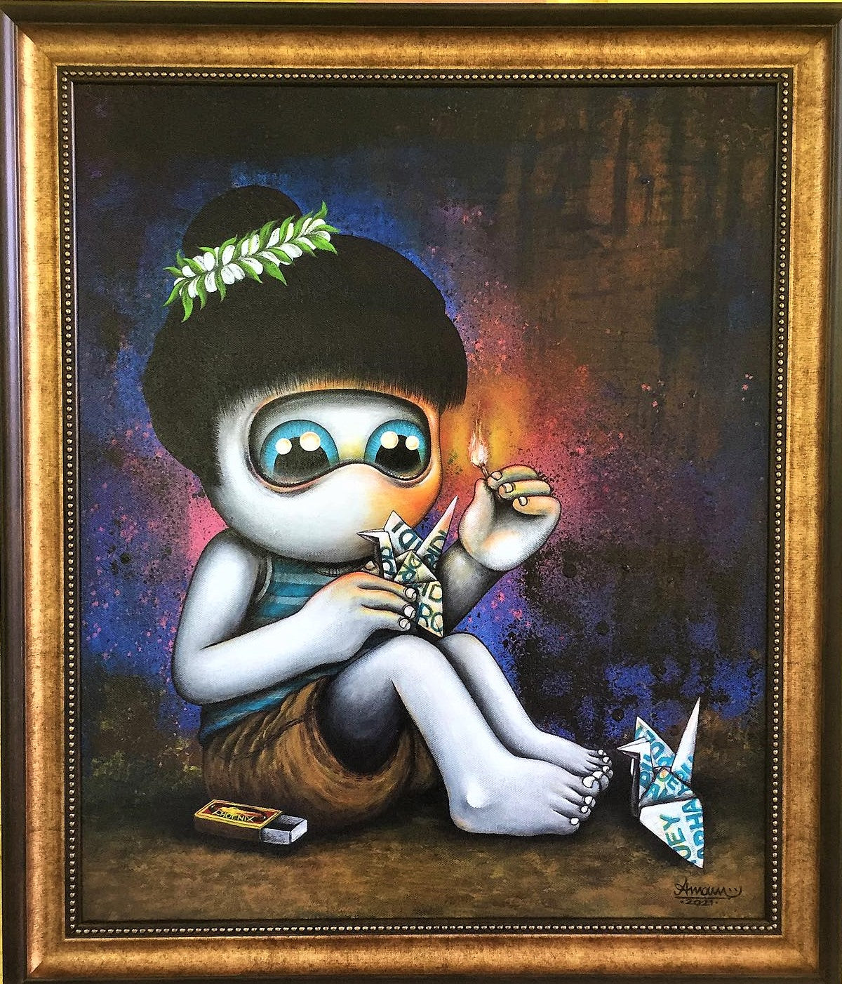 Artwork on supported wooden frame. Ready to hang.