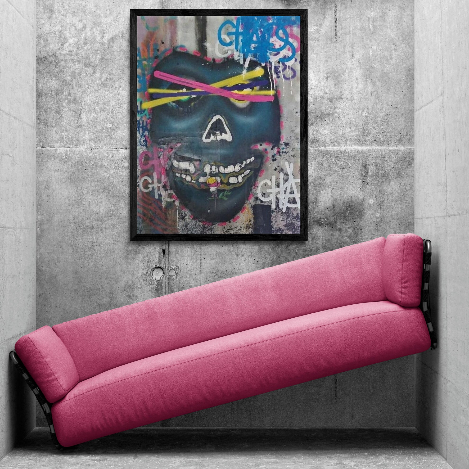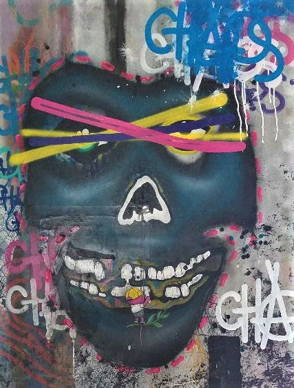 Acrylics and spray paint on canvas.
